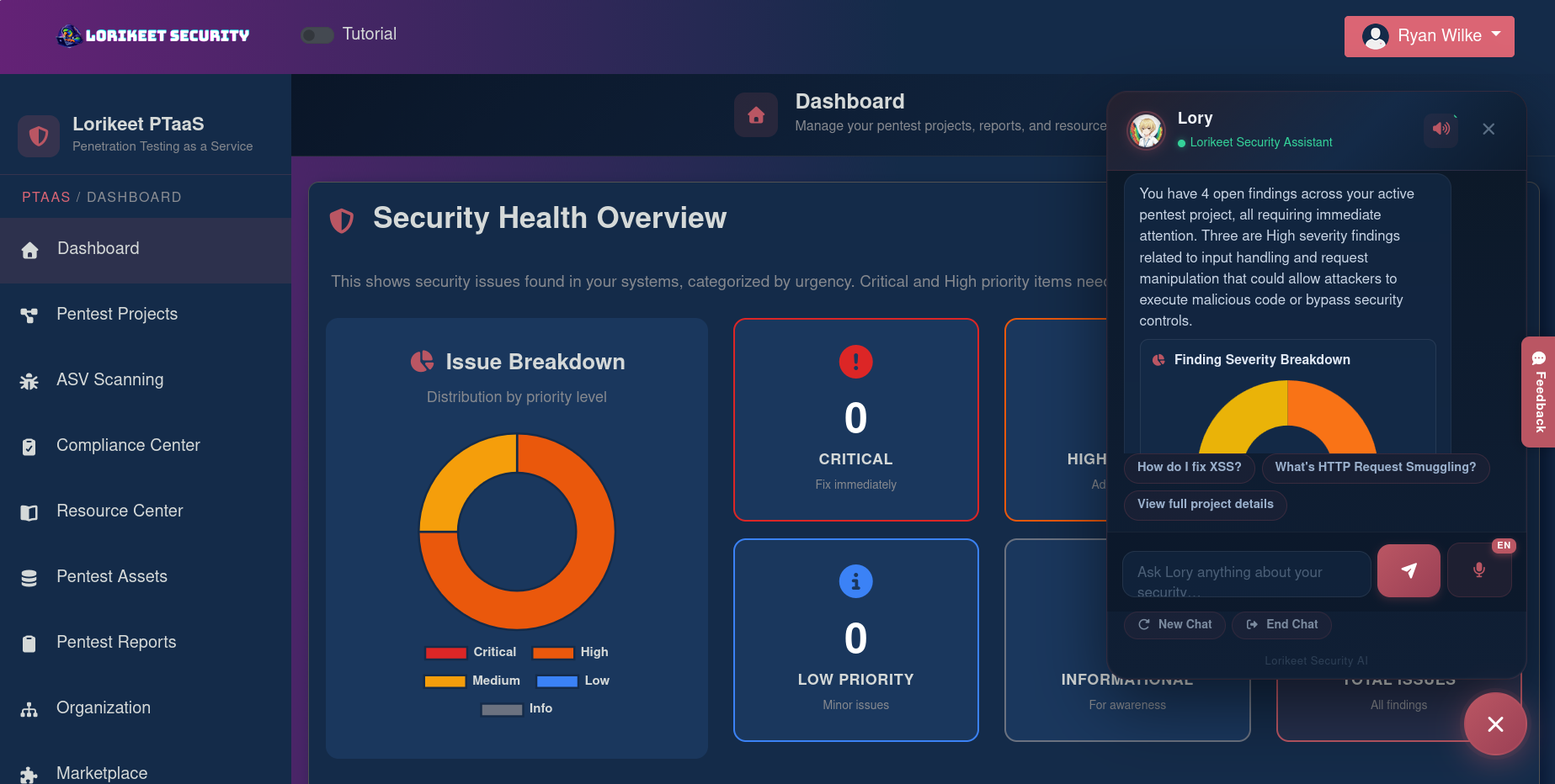 Operational Efficiency: A real-time portal consolidates pentest progress, attack surface findings, and compliance readiness into one view. Because every test is 100% manual and includes free retesting, you avoid the scanner noise and back-and-forth that typically stalls sprints. Lory, the AI assistant trained on ~2,000 vulnerability entries, helps teams translate findings into action.